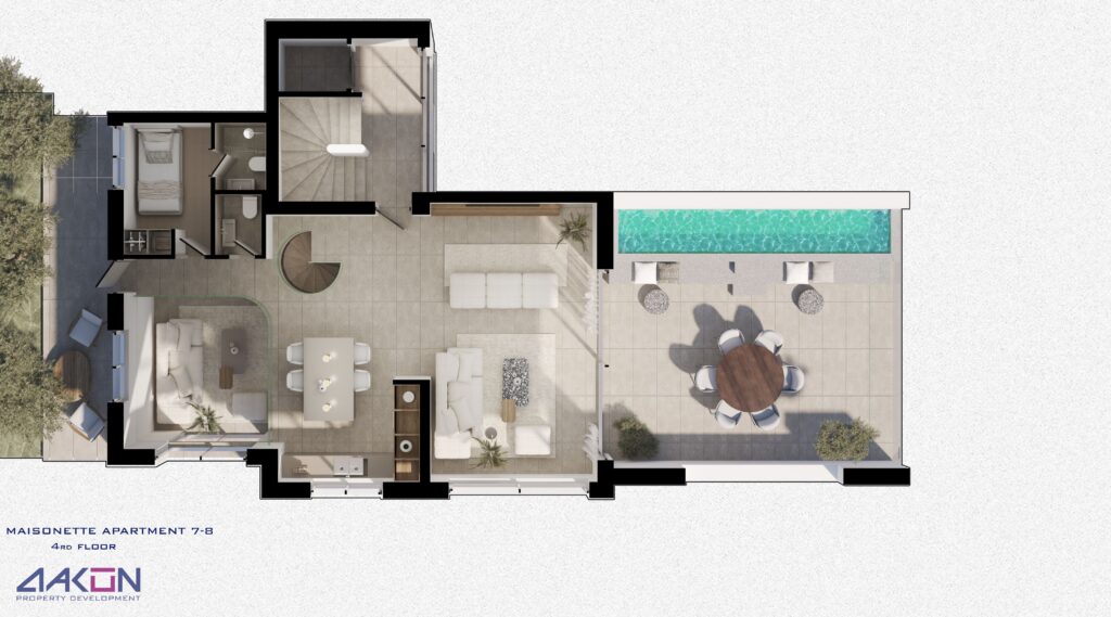 | Maisonette Apartment 8 | 134.8 sq.m. | 2nd & 3rd Floor | 3 bedrooms – 2 of which have private en-suite bathrooms – 1 additional bathroom, 1 guest W.C., kitchen, dining area, and living room. Also features spacious front and rear verandas totaling 70 sq.m., with a private 8 sq.m. swimming pool, as well as a private courtyard. |
