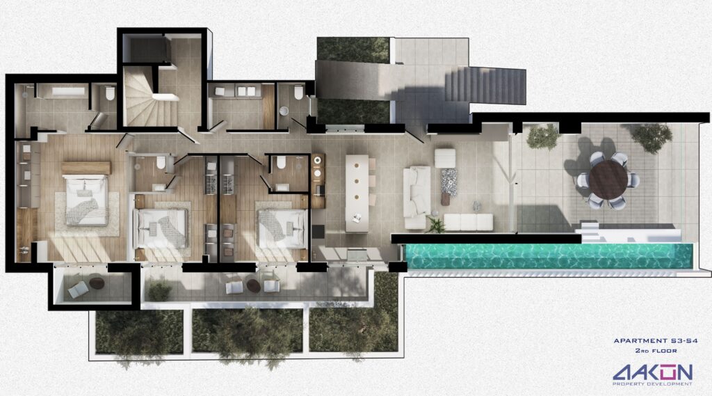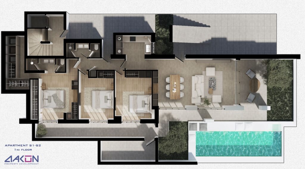| Apartment 2 | 137 sq.m. | Ground Floor | 3 bedrooms – one of which is a master with a private en-suite bathroom – 1 additional bathroom, kitchen, dining area, and living room. Features a spacious 105 sq.m. veranda with a private 23 sq.m. swimming pool. |