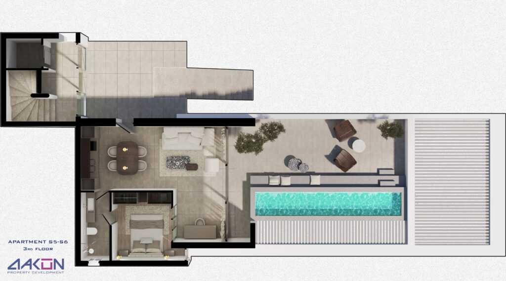 | Apartment 6 | 52.8 sq.m. | 2nd Floor | 1 bedroom, bathroom, kitchen, dining area, and living room. Also features a spacious 47 sq.m. veranda with a private 8 sq.m. swimming pool. |