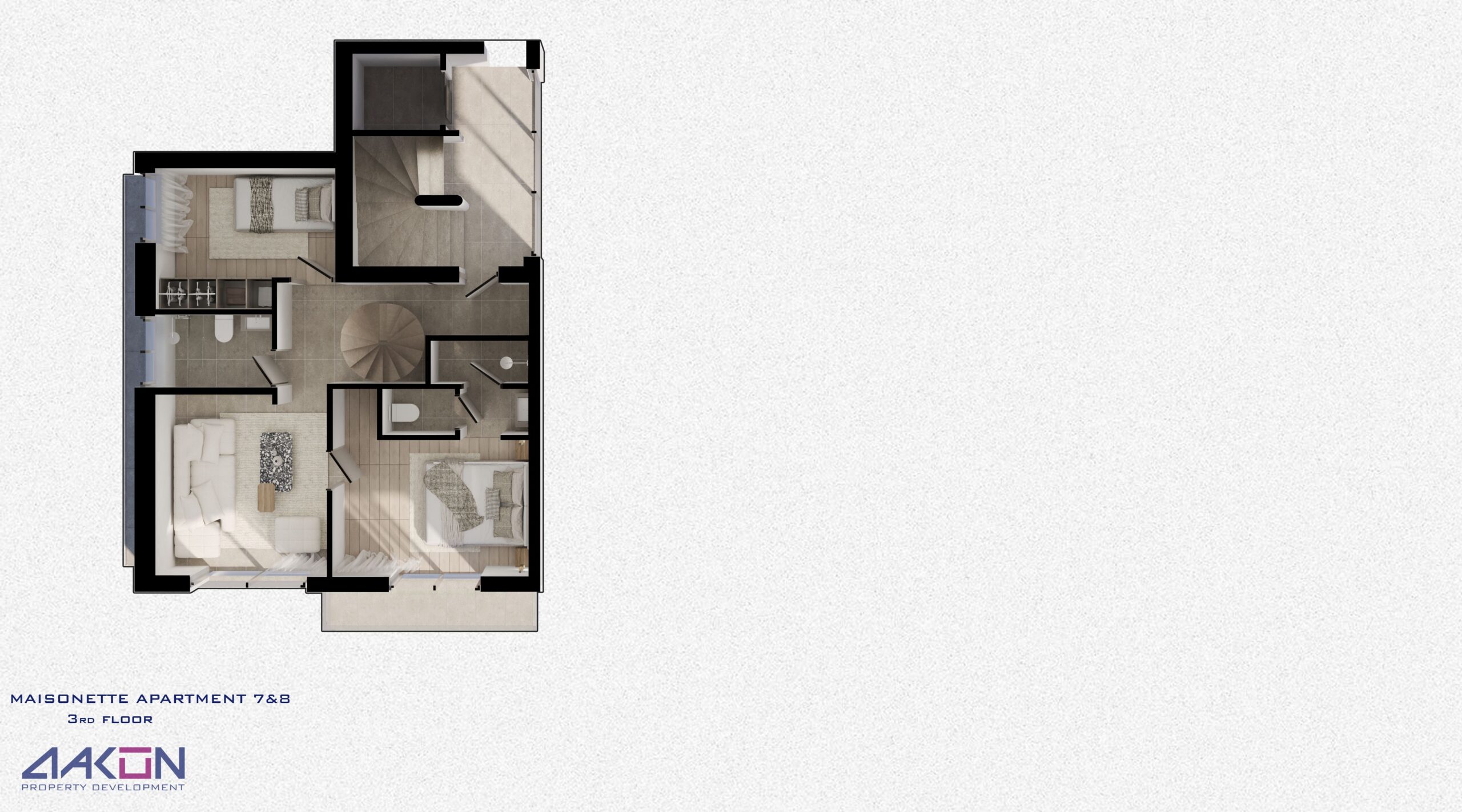 Maisonette Apartment 7 134.8 sq.m. 2nd & 3rd Floor 3 bedrooms – 2 of which have private en-suite bathrooms – 1 additional bathroom, 1 guest W.C., kitchen, dining area, and living room. Also features spacious front and rear verandas totaling 70 sq.m., with a private 8 sq.m. swimming pool, as well as a private courtyard.