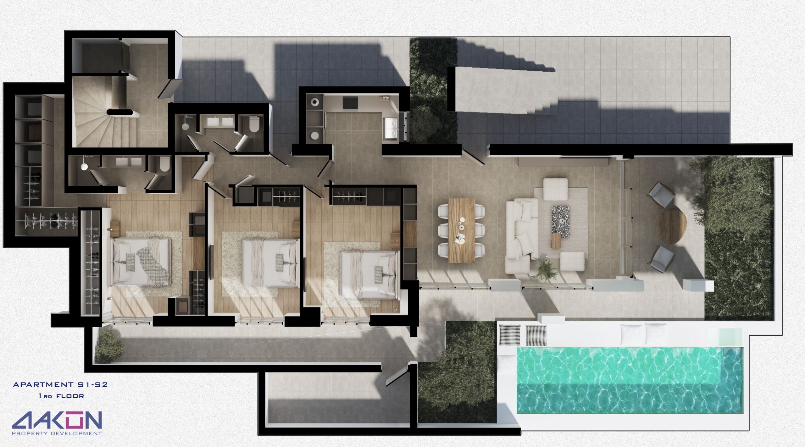 Apartment 3 152.6 sq.m. 1st Floor 3 bedrooms with private en-suite bathrooms, 1 guest W.C., 1 storage room, kitchen, dining area, and living room. Also features a spacious 64 sq.m. veranda with a private 11 sq.m. swimming pool.