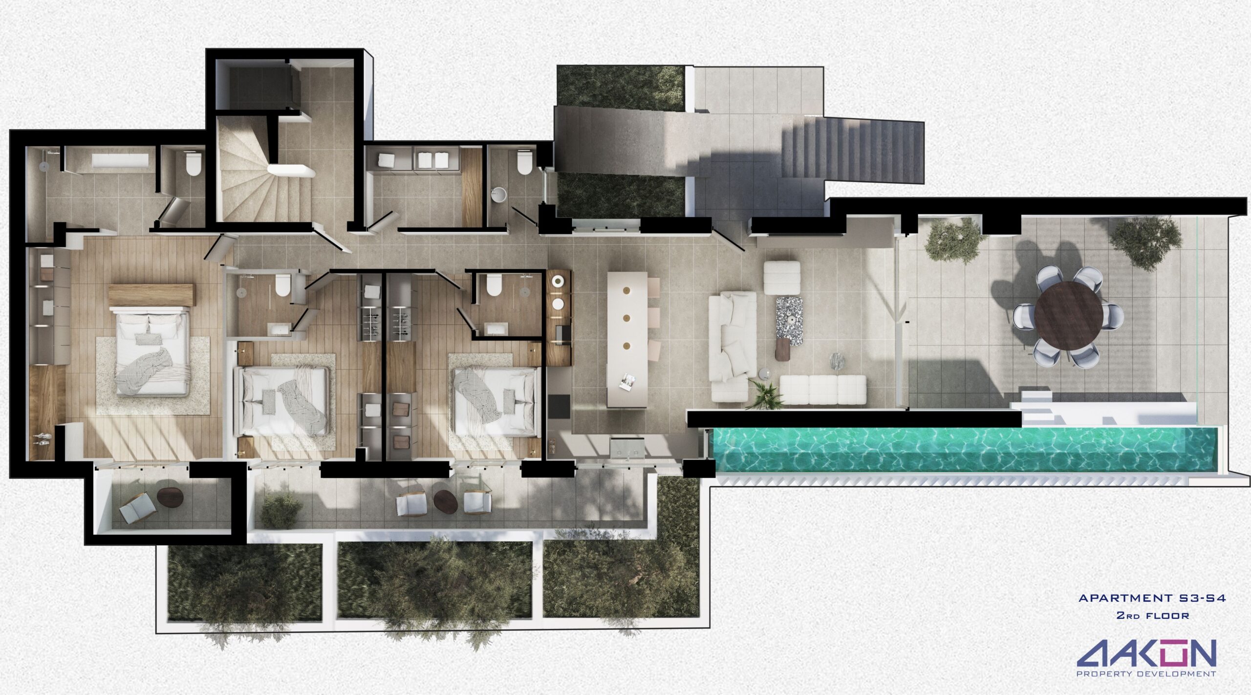 Apartment 6 52.8 sq.m. 2nd Floor 1 bedroom, bathroom, kitchen, dining area, and living room. Also features a spacious 47 sq.m. veranda with a private 8 sq.m. swimming pool.