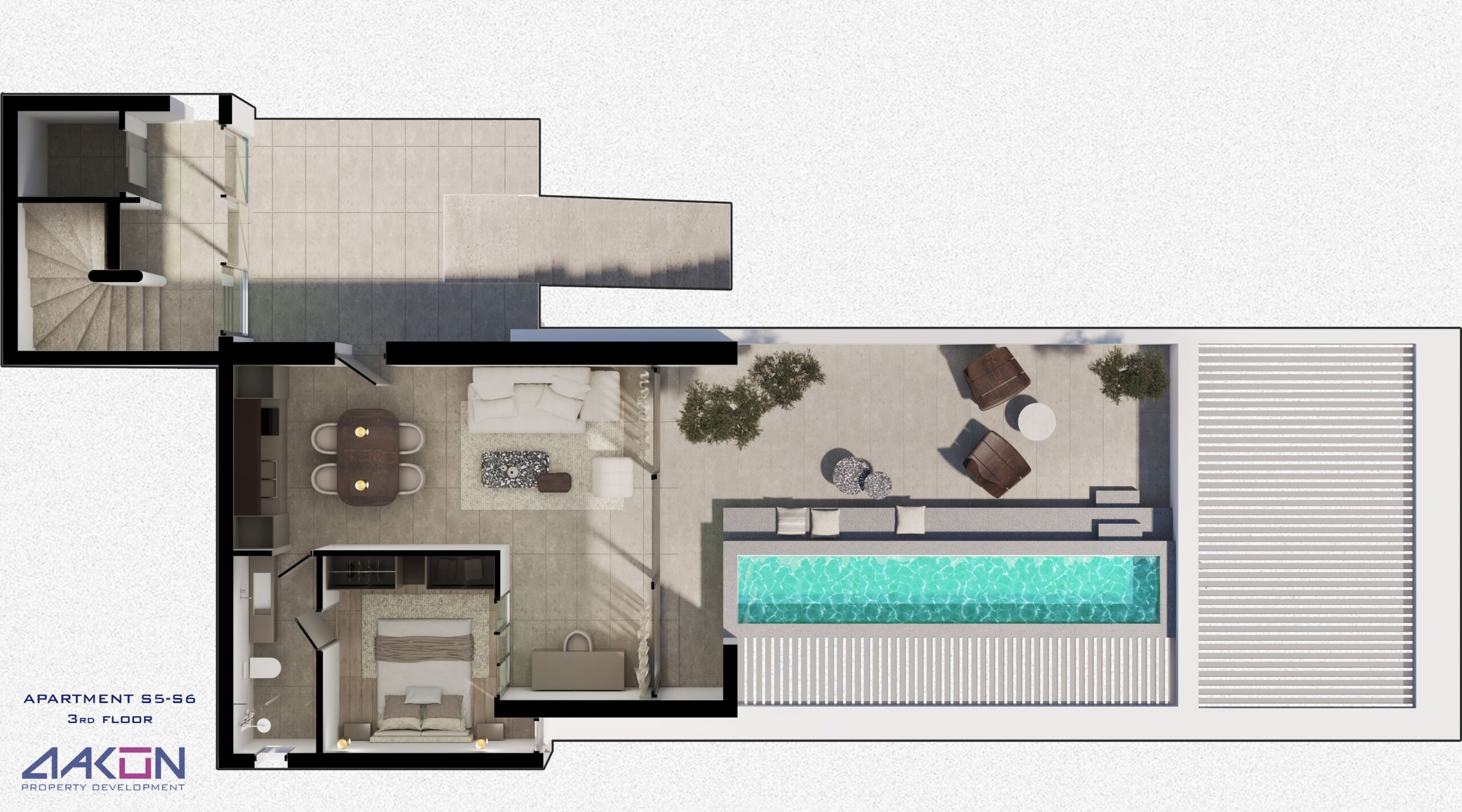 Apartment 5 52.2 sq.m. 2nd Floor 1 bedroom, bathroom, kitchen, dining area, and living room. Also features a spacious 47 sq.m. veranda with a private 8 sq.m. swimming pool.